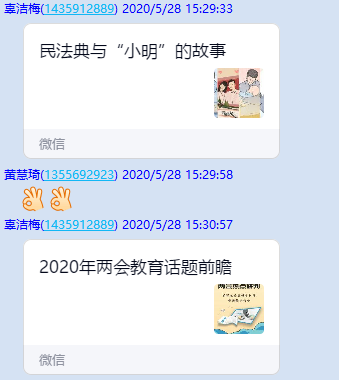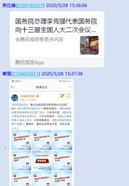 張老師以“特殊之年的全國(guó)兩會(huì)有啥不一樣”為題向大家科普了關(guān)于“兩會(huì)”的基本信息,分析了今年這個(gè)特殊時(shí)期兩會(huì)的“變”與“不變”。并且提醒各位同志可通過(guò)“學(xué)習(xí)強(qiáng)國(guó)”等平臺(tái)持續(xù)關(guān)注兩會(huì)信息,并歡迎大家隨時(shí)在黨支部群里分享自己的感悟心得,大家一起學(xué)習(xí)探討。會(huì)議中,各位黨員同志在支部群展開了激烈的討論,辜潔梅同志講解了自己重點(diǎn)關(guān)注的《民法典》,并在影視系學(xué)生支部群分享了人民日?qǐng)?bào)有關(guān)民法典的推文—“民法典與小明的故事”。隨后,焦巡峰、曹雯等同志也紛紛發(fā)言,并表示兩會(huì)中,人大代表的發(fā)聲就是群眾的聲音,兩會(huì)不僅和我們的生活緊密聯(lián)系,而且自始至終貫徹著人民當(dāng)家作主這一本質(zhì)要求。