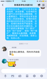 2020年2月27日下午,重慶師范大學新聞與傳媒學院四個學生支部(新聞系學生支部、影視系學生支部、新媒體系學生支部、研究生支部)全體黨員通過線上語音連線、群消息溝通方式等開展了“戰(zhàn)疫進行時,黨員在行動”主題教育活動。本次黨日活動主要圍繞學習貫徹習近平總書記在統(tǒng)籌推進新冠肺炎疫情防控和經(jīng)濟社會發(fā)展工作部署會議上的重要講話精神進行。