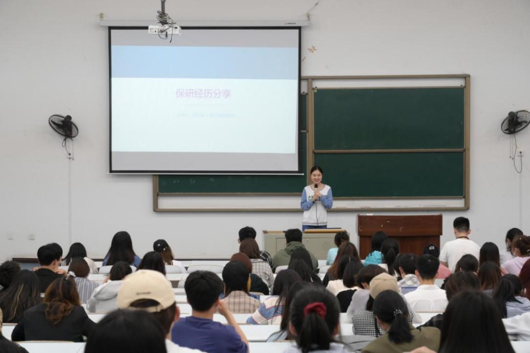以初試第三、最終排名第二的好成績(jī)進(jìn)入西南財(cái)經(jīng)大學(xué)新聞與傳播專業(yè)的新聞學(xué)專業(yè)白穎琪同學(xué)從選擇、努力、心態(tài)這三個(gè)關(guān)鍵詞出發(fā),為大一學(xué)生進(jìn)行了一段邏輯清晰的演講。她分享道:“要找到一個(gè)說(shuō)服自己考研的理由,考研的動(dòng)力來(lái)源于讓你自己有堅(jiān)持下去的毅力。”同樣,她也提到在考研過(guò)程中應(yīng)該拒絕焦慮,保持良好的心態(tài)。