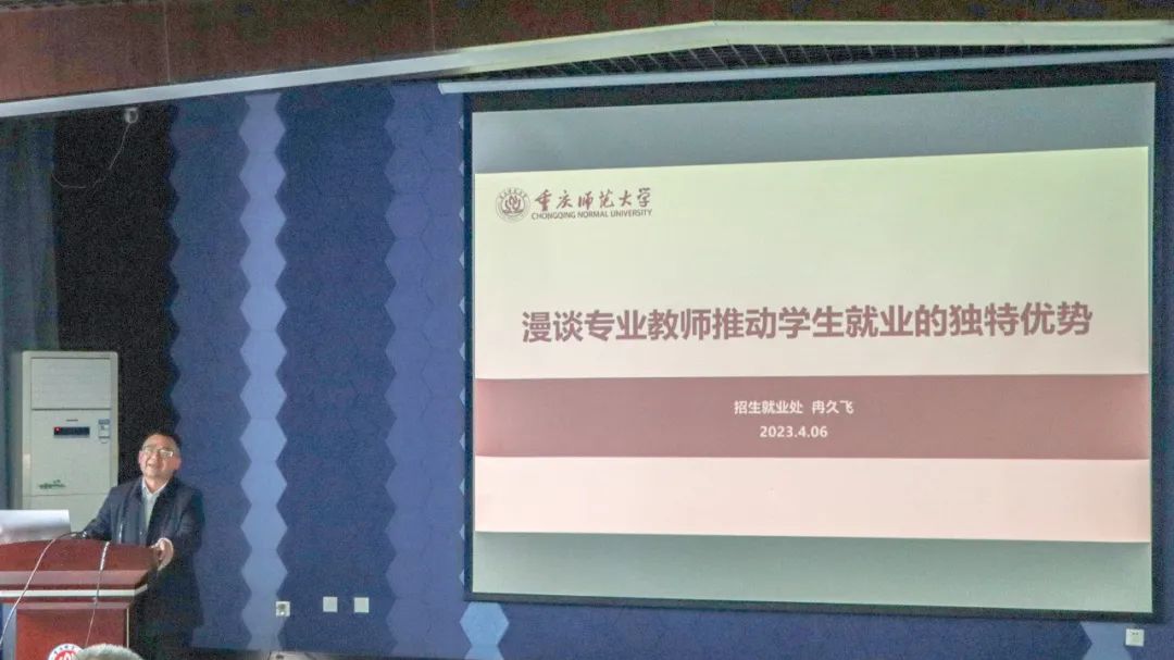 4月6日下午,圖北樓7206教室一場(chǎng)風(fēng)趣幽默的講座引來現(xiàn)場(chǎng)觀眾陣陣歡笑和掌聲。這是新聞與傳媒學(xué)院為推動(dòng)就業(yè)工作高質(zhì)量發(fā)展,特邀校招生就業(yè)處處長(zhǎng)冉久飛在全院教職工大會(huì)上開展就業(yè)工作指導(dǎo),講座主題為“漫談專業(yè)教師推動(dòng)學(xué)生就業(yè)的獨(dú)特優(yōu)勢(shì)”。院長(zhǎng)顏春龍主持講座,學(xué)院黨政領(lǐng)導(dǎo)及全體教職工現(xiàn)場(chǎng)聆聽。