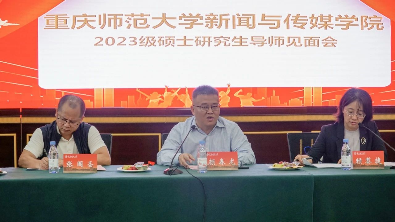 為促進研究生新生與學(xué)院領(lǐng)導(dǎo)、老師之間的溝通交流,9月28日上午,新聞與傳媒學(xué)院2023級碩士研究生開學(xué)典禮暨導(dǎo)師見面會在博雅樓503會議廳舉行。新聞與傳媒學(xué)院院長顏春龍、副院長賴?yán)杞荨⒏痹洪L楊琪、校外碩士生導(dǎo)師光明日報重慶記者站站長張國圣、重慶日報農(nóng)業(yè)農(nóng)村新聞部主任鄒密、重慶廣播電視總臺少兒頻道總監(jiān)、重慶廣電教育副總經(jīng)理田纓、潼南區(qū)職教中心黨委副書記余艷青、重慶衛(wèi)視編委兼融合傳播中心副主任徐濤、重慶廣播電視集團總臺第一眼新聞財經(jīng)資訊欄目制片人童師亮、校內(nèi)碩士生導(dǎo)師、研究生專業(yè)班主任、研究生教學(xué)秘書、輔導(dǎo)員、2023級全體碩士研究生新生和2021級碩士研究生代表參加本次見面會,典禮由我院副院長賴?yán)杞萁淌谥鞒帧?/p>