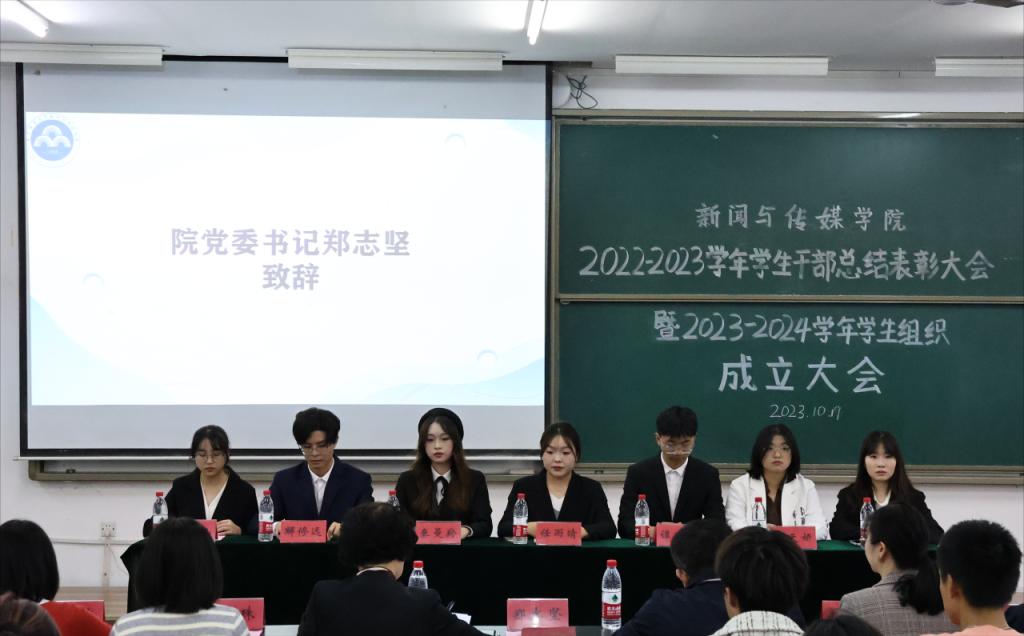 10月19日下午,新聞與傳媒學(xué)院2022-2023學(xué)年干部總結(jié)表彰大會暨2023-2024學(xué)年學(xué)生組織成立大會在T2113教室舉行。學(xué)院黨委書記鄭志堅,副書記趙艷君,副院長楊琪,學(xué)工辦主任、分團委書記曾珠,融媒體中心指導(dǎo)老師楊越以及各年級輔導(dǎo)員出席會議,學(xué)院分團委·學(xué)生會、創(chuàng)新創(chuàng)業(yè)服務(wù)中心、融媒體中心全體成員參加會議。院分團委學(xué)生副書記李宗憶主持大會。