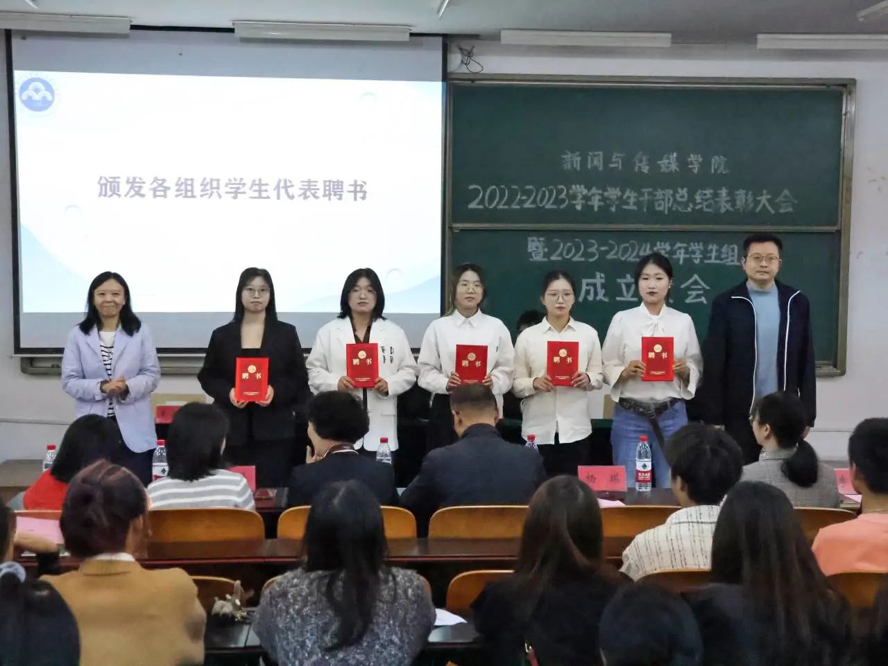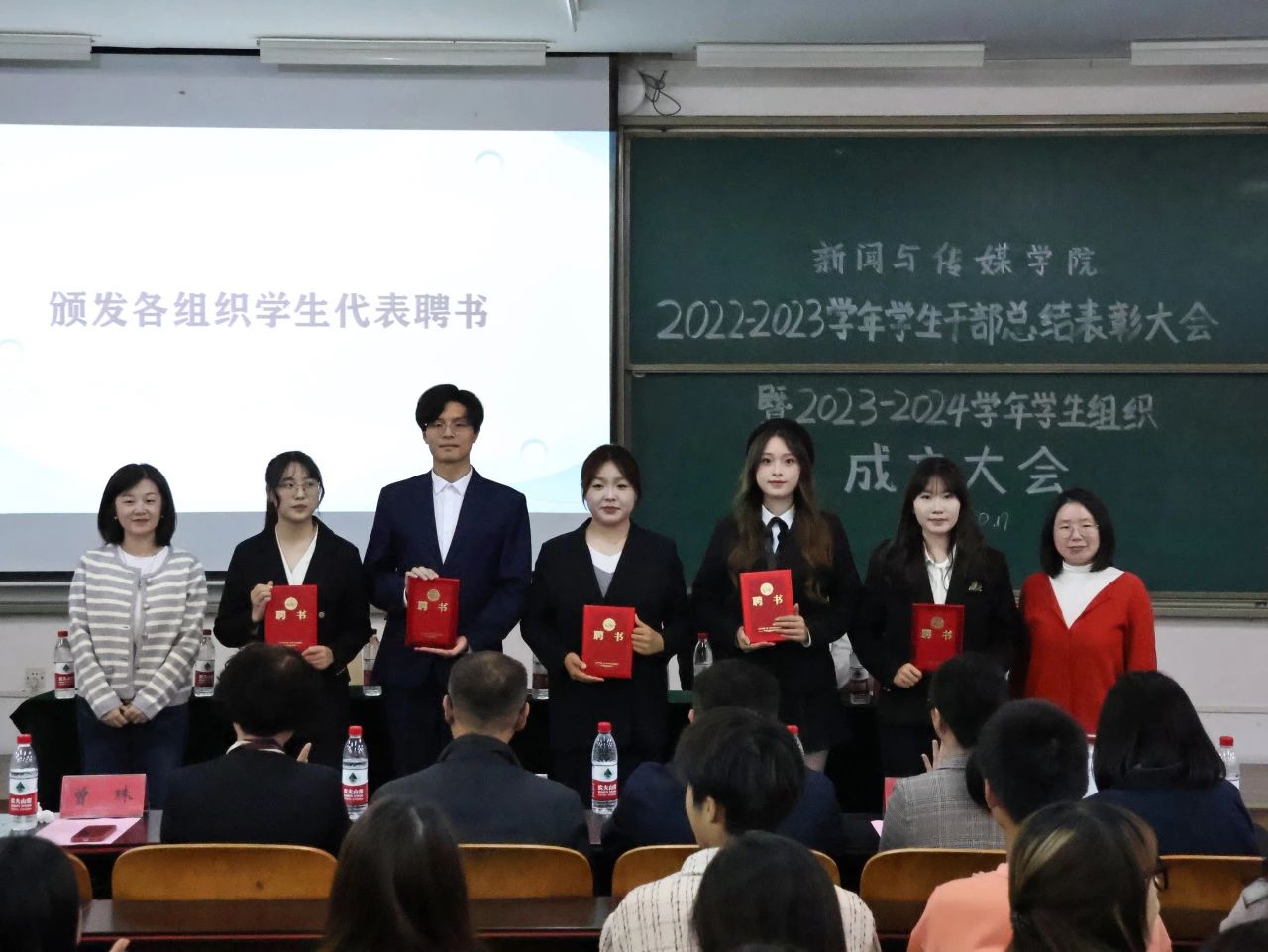 宣誓完畢,楊琪副院長,分團委書記、學(xué)工辦主任曾珠,輔導(dǎo)員張康、趙陽陽、李暢,融媒體中心指導(dǎo)老師楊越分別為各新一屆學(xué)生組織代表頒發(fā)聘書。
