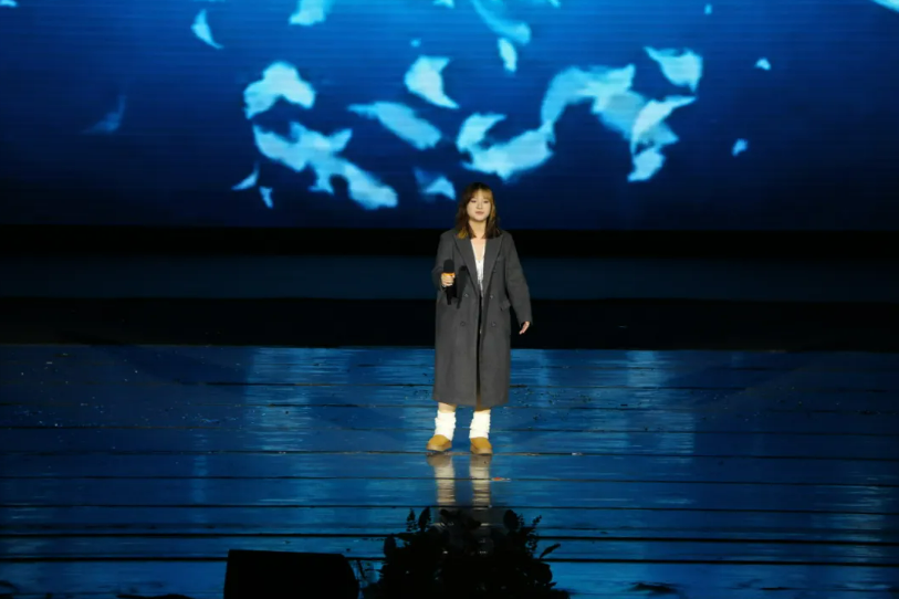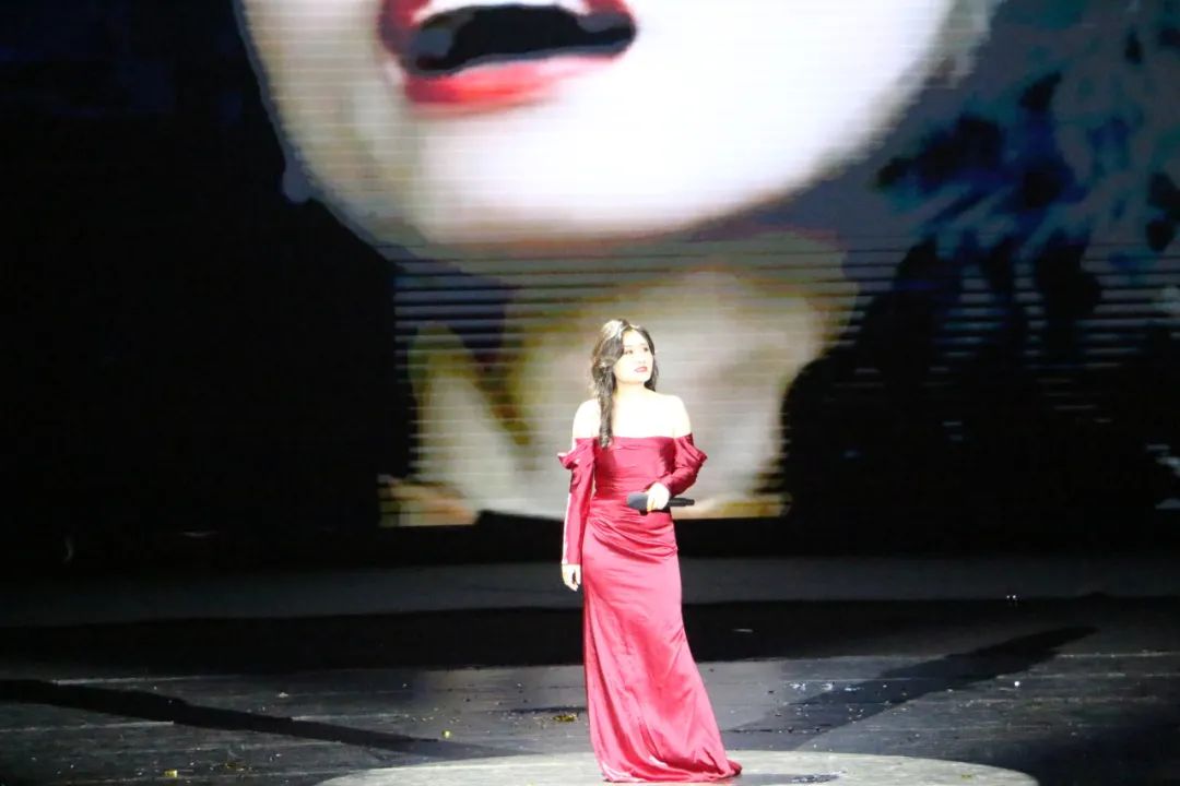 總有一朵堅韌的花,在俗世浮沉中綻放芬芳;總有一段經(jīng)典的旋律,在歲月流淌中始終璀璨。一束柔和的光灑在身著紅裙的研究生代表王雨藍(lán)身上,如同綻放的玫瑰。她手持麥克風(fēng),歌聲纏綿悱惻,直擊人心。