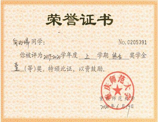 向兆瑞,2017級新聞與傳媒學(xué)院影視攝影與制作專業(yè)學(xué)生,獲得2020年國家獎學(xué)金,6次一等獎學(xué)金,現(xiàn)收到了西南大學(xué)的研究生推免錄取通知。
