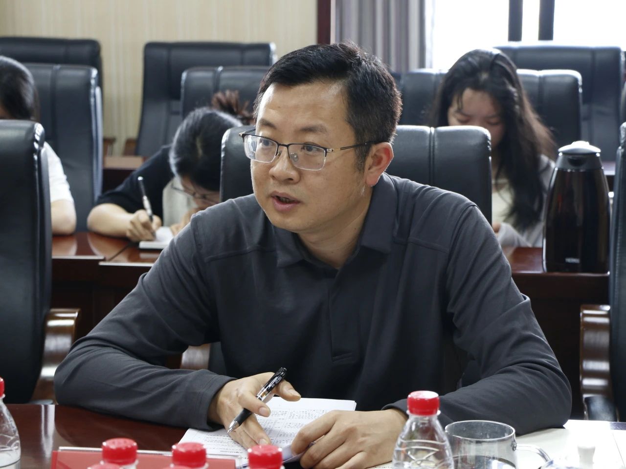 彭膺昊副處長(zhǎng)耐心聽(tīng)取與會(huì)人員提出的問(wèn)題,并作出回應(yīng)。他將積極協(xié)調(diào)相關(guān)部門,以暢通學(xué)院與各方的聯(lián)通機(jī)制,從學(xué)院需求出發(fā),切實(shí)解決實(shí)際問(wèn)題,為學(xué)院學(xué)科建設(shè)、師生發(fā)展提供更為實(shí)質(zhì)性的支持。此外,彭膺昊副處長(zhǎng)也希望重慶新聞學(xué)院能夠?yàn)槭形麄鞑刻峁┤瞬刨Y源支持,雙方相互支持,共建共享。雙方在會(huì)議交流中表示,將進(jìn)一步加強(qiáng)聯(lián)系與合作,推動(dòng)部校共建工作深入開(kāi)展,開(kāi)啟重慶新聞學(xué)院發(fā)展新篇章。