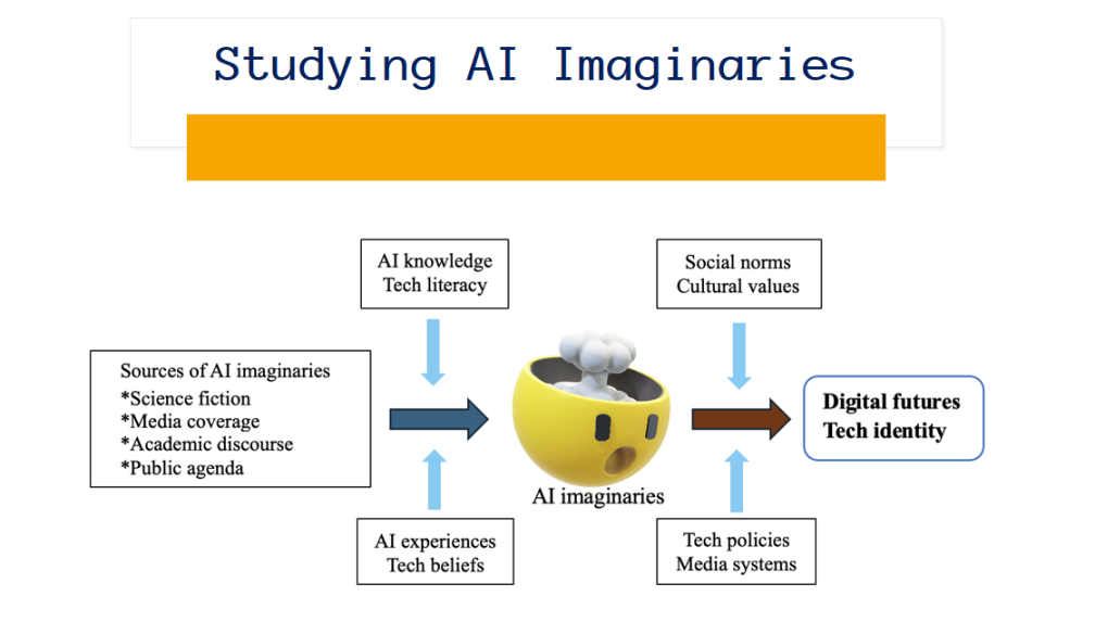 隨后,鐘教授介紹了AI想象模型,從技術信仰、文化價值、政策系統(tǒng)到媒體敘事等多重維度闡釋AI在構建數(shù)字未來中的多層次影響。他認為,AI想象作為鏡像身份,促使人們在認同中塑造共同體,并通過正向想象促進技術信任與采納。